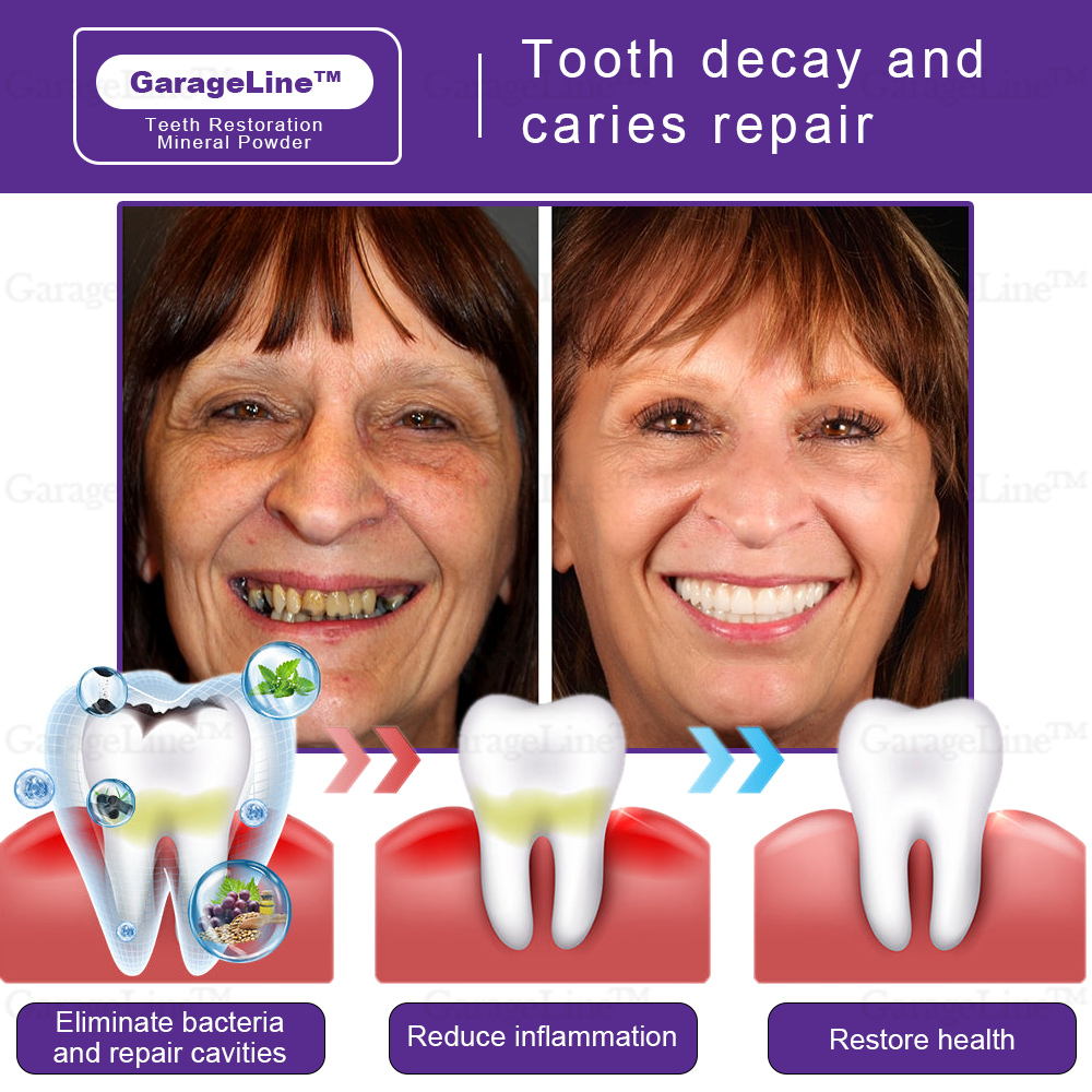 GarageLine™ Teeth Restoration Mineral Powder eliminates 99.99% of bacteria, resolves bad breath, removes plaque and tartar, treats gingivitis and periodontitis, relieves toothache, prevents and treats cavities, restores tooth enamel, stimulates reparative dentin formation, and supports the regeneration of lost teeth.