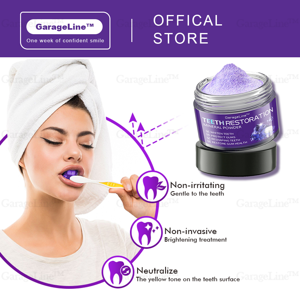 Experience noticeable whitening results in just one week with GarageLine™ Teeth Restoration Mineral Powder. Purple is the opposite and complementary color of yellow on the color wheel, so applying water-soluble purple dye to your teeth will counteract any yellow undertones. Plus, its vitamin C-rich formula removes plaque, tartar, and discoloration, restoring teeth to their natural whiteness.